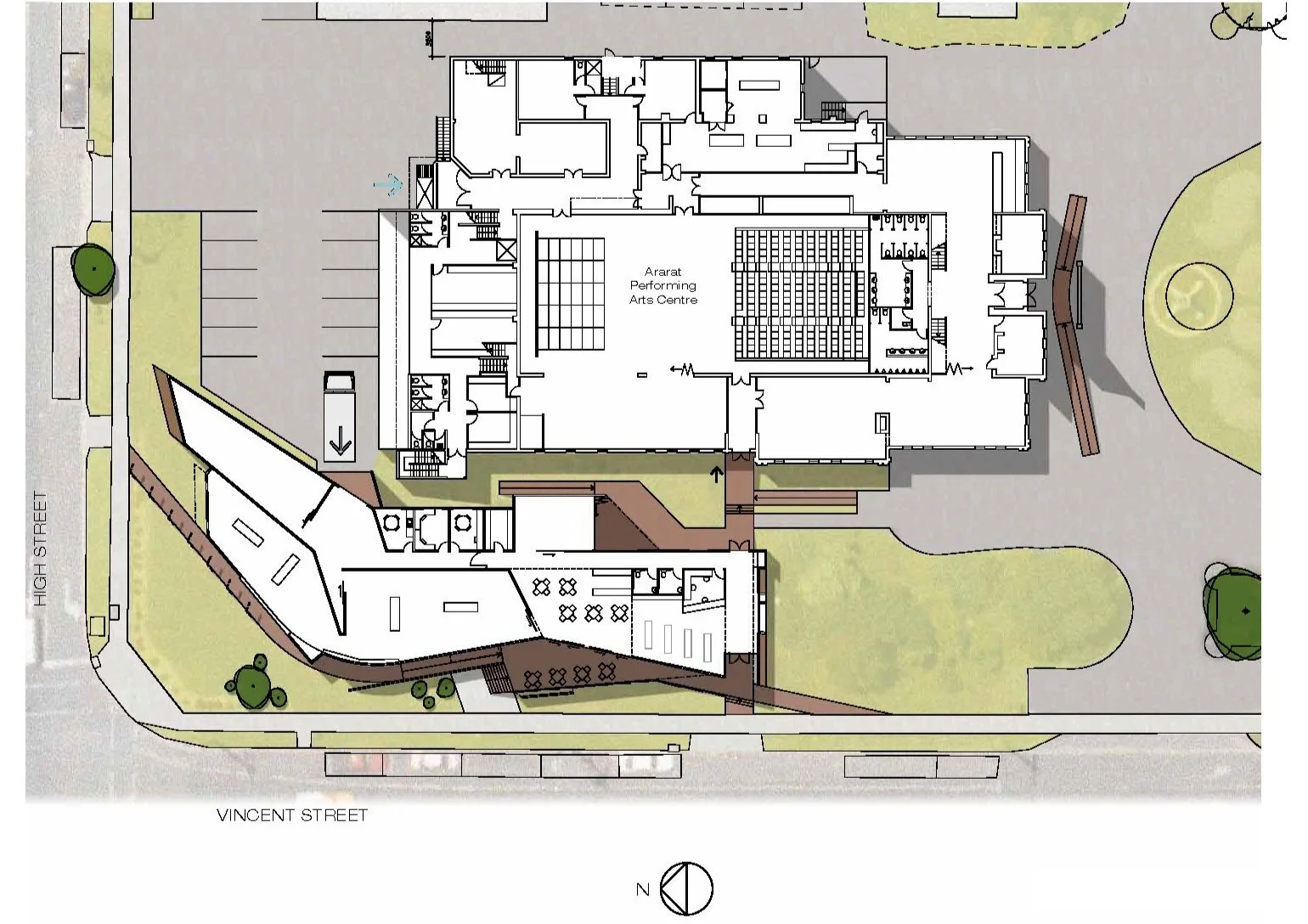 Harmer Architecture prepared the project brief for the redevelopment of the Ararat Performing Arts Centre and new Regional Gallery in October 2008. Part of this brief was to explore siting options available for the location of the new Gallery and provide a recommendation. The Performing Arts Centre is located in the historical former Ararat Town Hall in Market Square in which development is controlled by a Conservation Management Plan.