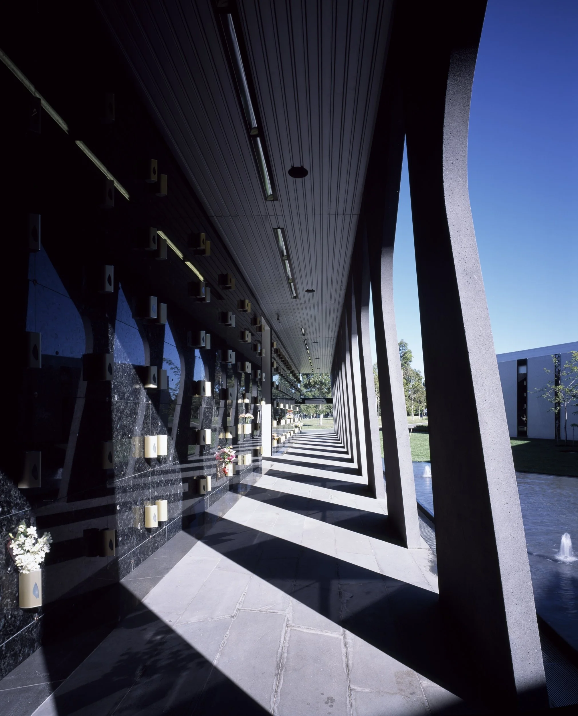 In contrast to the definitive monumental nature of the adjacent neoclassical edifice this contemporary approach has no real beginning nor end and as such was considered to be a more comforting and optimistic environment in which to grieve”