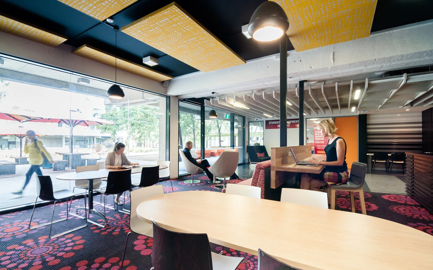 Various seating modes were provided to the Student areas to create diversity, including lounge type seating for individuals and groups, seating at benches with provision of power and data, group study tables. Consultation lounge pods in the Student Development Centre were also provided to enable consultations to occur in an inviting and comfortable environment.